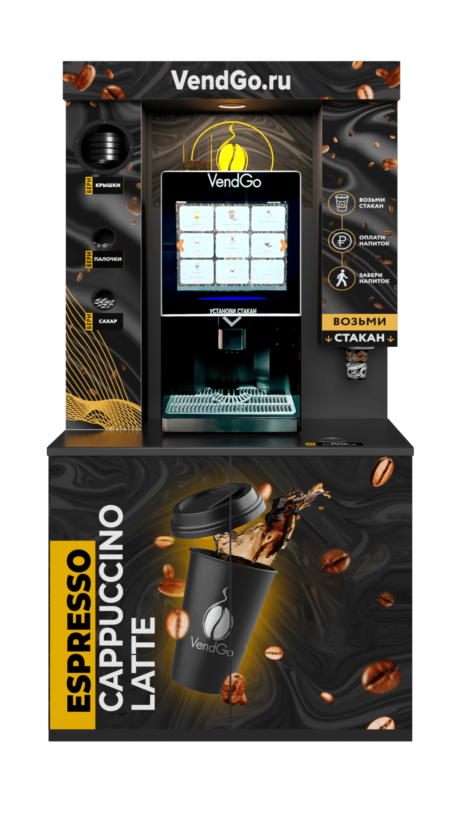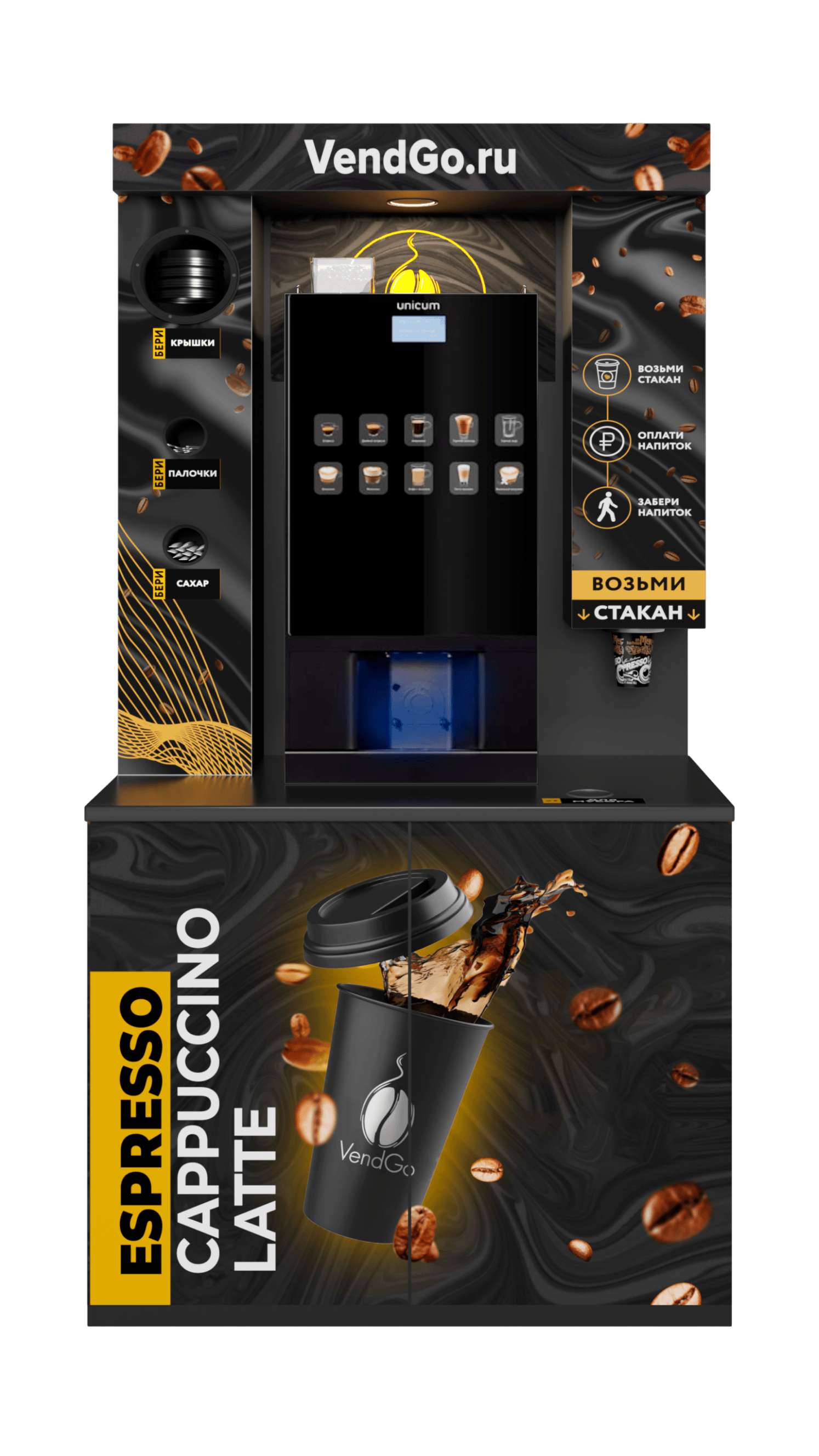 • Кофемашина нового поколения LV307. • ЖК дисплей и сенсорное управление • Антивандальная тумба с вертикальной выдачей стаканов • Рецептура, разработанная бариста • Настроенный терминал для безналичной оплаты